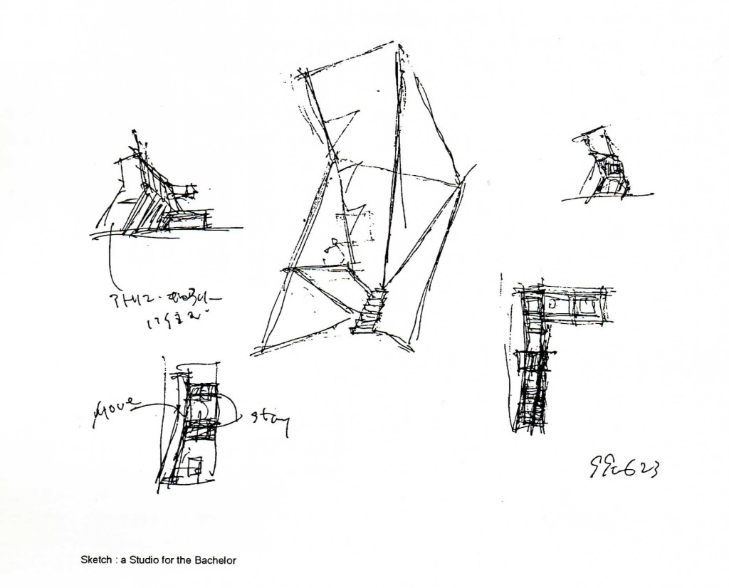 「超領域」は都市や建築のただなかに生み出される場所であった。今、もうひとつの 微分不能点の可能性を僕は考えている:それはく独身者のためのスタジオ>だこそれは屈折そのものを具現する。