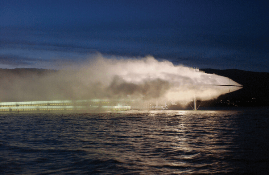 これは体積のない質量の建築です。霧は根本的な不安定性の媒介であり、音を抑え、身体と地面の関係を溶かす厚いホワイトノイズです。霧の中で空気は不透明な固体となり、肺を占領し髪に張り付く物質となり、ナビゲーションという行為を儚いものとの感覚的な交渉に変えています。維持すべき仮面はなく、水と大気の均衡を維持するための絶え間ない機械的な努力だけがある。「建物」はその闘いの緊張の中にしか存在しない。ポンプが止まるか風向きがアルプスに向かうと、空気が一時的に濃くなりそうな空気の濃さ。
